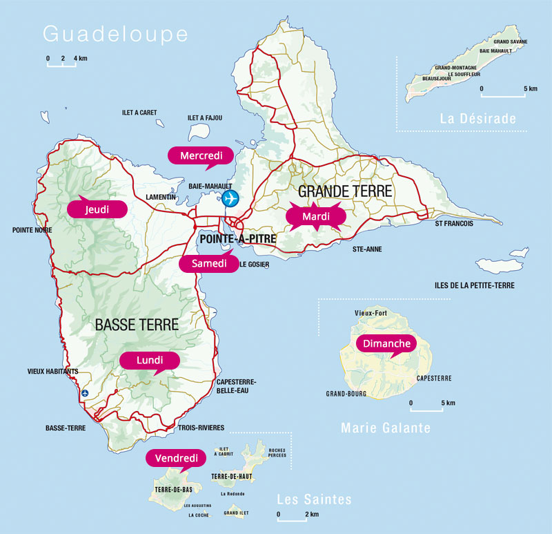 | Excursion guidée à la journée au départ de l’hôtel, direction Trois-Rivières. Après une brève traversée, vous débarquez à Terre-de-Haut. Au programme, découverte de l’île avec visite du Fort Napoléon, visite de l'île, déjeuner les pieds dans l’eau pour finir... |